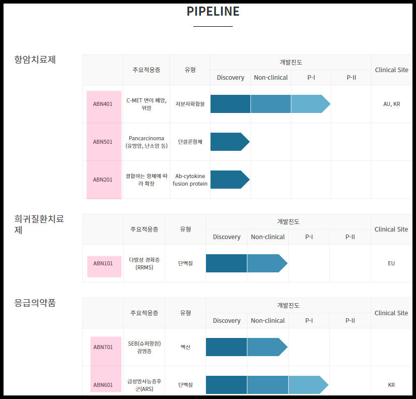 대표 파이프라인인 ABN401은 주요 폐암과 위암 등을 대상으로 하는 표적항암제이고, 현재 호주와 한국에서 진행하고 있는 글로벌 임상 1, 2상은 용량 증량 시험을 마친 상태라고 하네요. 올해 미국에서 임상 2상을 실시할 예정입니다.