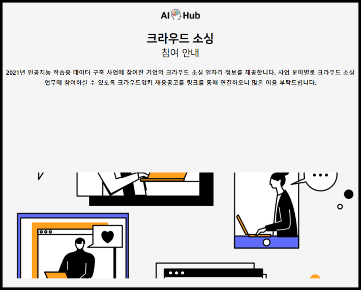 안녕하세요. 정부의 인공지능 학습용 데이터 구축 사업이 진행되고 있는데요. 올 초에 AI허브라는 홈페이지에 데이터 구축 사업에 참여한 기업의 일자리 정보를 제공해줬었는데요. 잠시 운영을 하지 않다가, 이제 다시 데이터 알바 일자리를 소개해주고 있습니다. 아래 이미지는 홈페이지 페이지 모습이에요.
