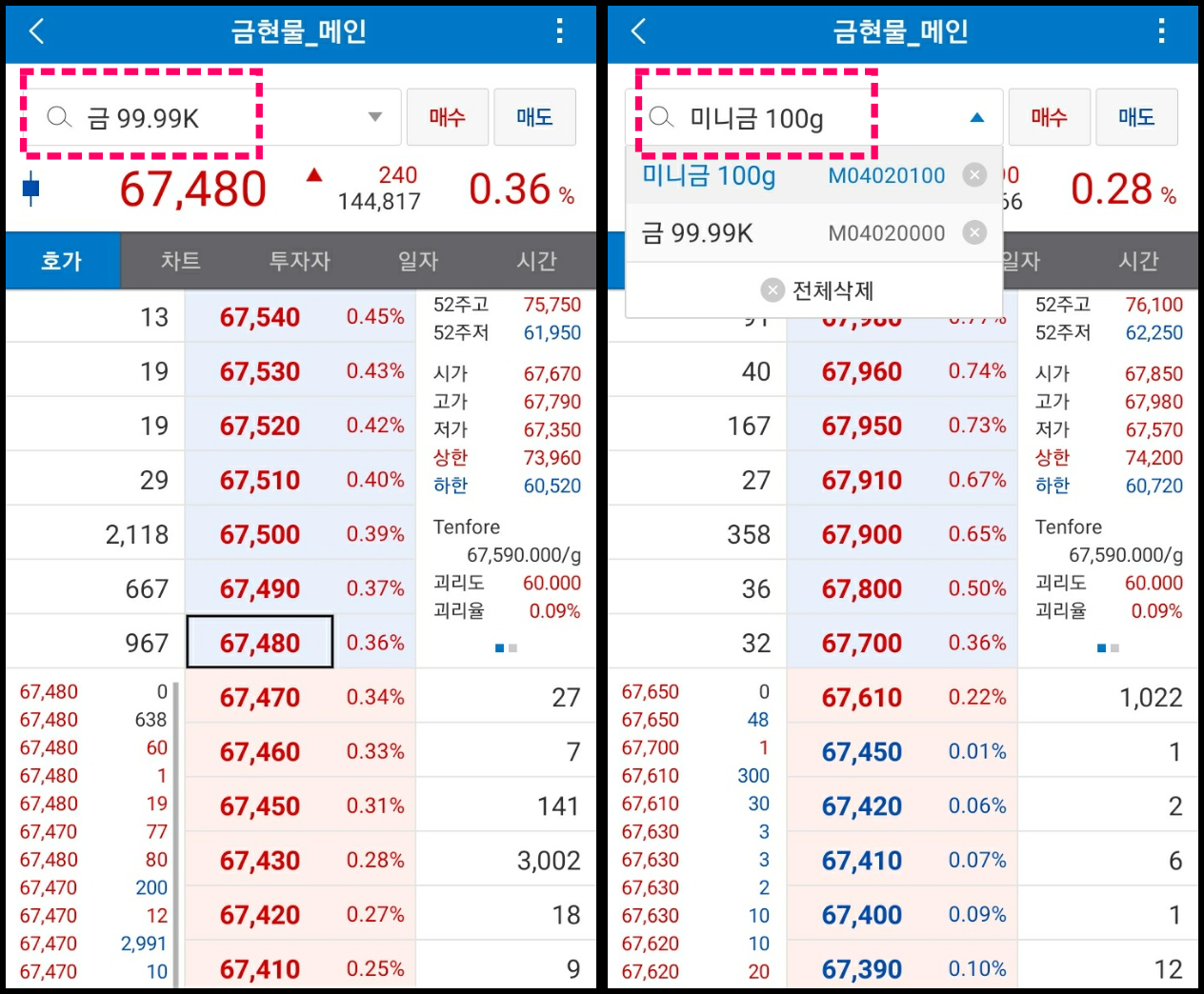 금의 종류는 금 99.99K와 미니금 100g 2가지가 있는데요. 이건 실물로 인출할 때 단위예요. 나중에 미니바 100g으로 인출을 원하면 미니금 100g을 사면 되고요. 골드바 1kg을 인출하려면 금 99.99K를 사면됩니다. 저는 현물로 인출할 생각은 없어서 1g당 가격이 매수할 당시에 저렴했던 금 99.99K를 샀어요.