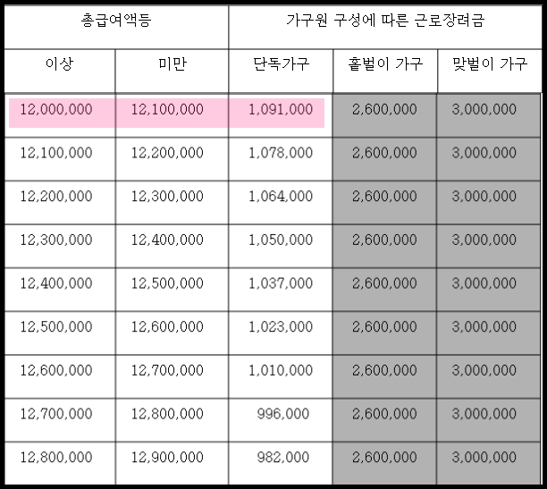 예를 들어, 단독 가구인 근로소득자가 한 달에 100만 원씩 6개월 일했다고 하면, 1200만 원이 총급여액이고, 근로장려금 산정표를 보면 근로장려금은 1,091,000원을 받을 수 있는데요. 거기에서 35%인 381,850원을 올해 12월에 받게 되는 것입니다. 나머지는 내년 6월과 9월에 받게 되는 것이고요.