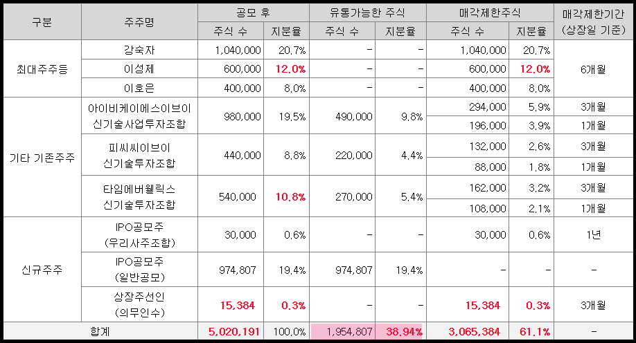 최대주주의 물량은 모두 의무보유 등록되고, 기존 주주의 물량 19.51% + 공모주주 물량 19.4%가 상장 직후 유통가능합니다.
