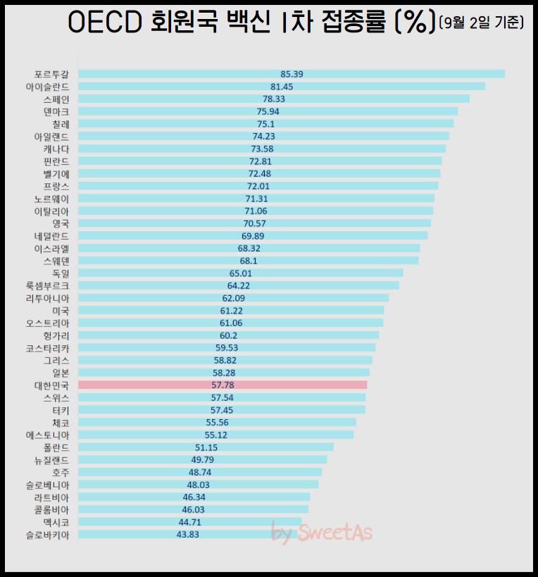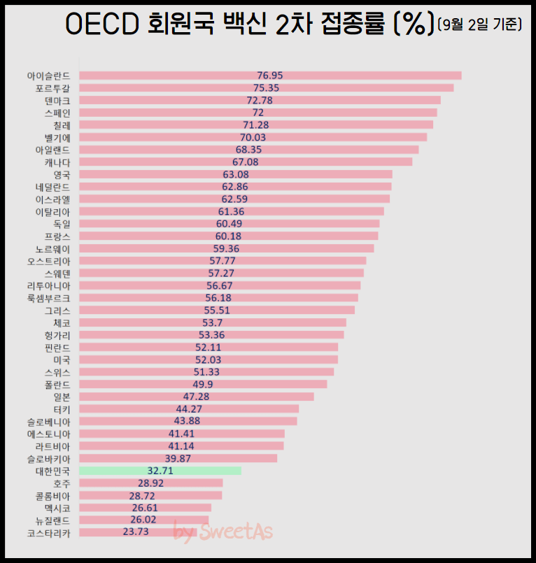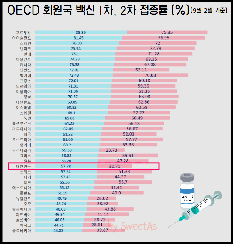 | OECD 회원국 코로나 백신 2차 접종률 (%) 1위 아이슬란드 76.95% 2위 포르투갈 75.35% 3위 덴마크 72.78% 4위 스페인 72% 5위 칠레 71.28% 6위 벨기에 70.03% 7위 아일랜드 68.35% 8위 캐나다 67.08% 9위 영국 63.08% 10위 네덜란드 62.86% 11위 이스라엘 62.59% 12위 이탈리아 61.36% 13위 독일 60.49% 14위 프랑스 60.18% 15위 노르웨이 59.36% 16위 오스트리아 57.77% 17위 스웨덴 57.27% 18위 리투아니아 56.67% 19위 룩셈부르크 56.18% 20위 그리스 55.51% 21위 체코 53.7% 22위 헝가리 53.36% 23위 핀란드 52.11% 24위 미국 52.03% 25위 스위스 51.33% 26위 폴란드 49.9% 27위 일본 47.28% 28위 터키 44.27% 29위 슬로베니아 43.88% 30위 에스토니아 41.41% 31위 라트비아 41.14% 32위 슬로바키아 39.87% 33위 대한민국 32.71% 34위 호주 28.92% 35위 콜롬비아 28.72% 36위 멕시코 26.61% 37위 뉴질랜드 26.02% 38위 코스타리카 23.73% |