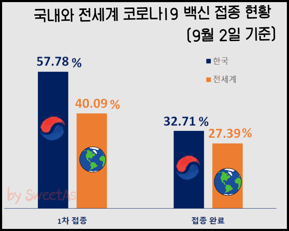 우리나라는 9월 3일 0시 기준으로 1차 접종은 총 29,644,464명으로 인구 대비 57.7%가 1차 접종을 받았고, 16,783,832명이 접종을 완료하여 인구 대비 32.7%가 접종을 완료하였습니다. 아래 표는 비교를 위해 9월 2일 기준으로 국내와 전세계 백신 접종 현황 그래프를 만들어봤습니다.