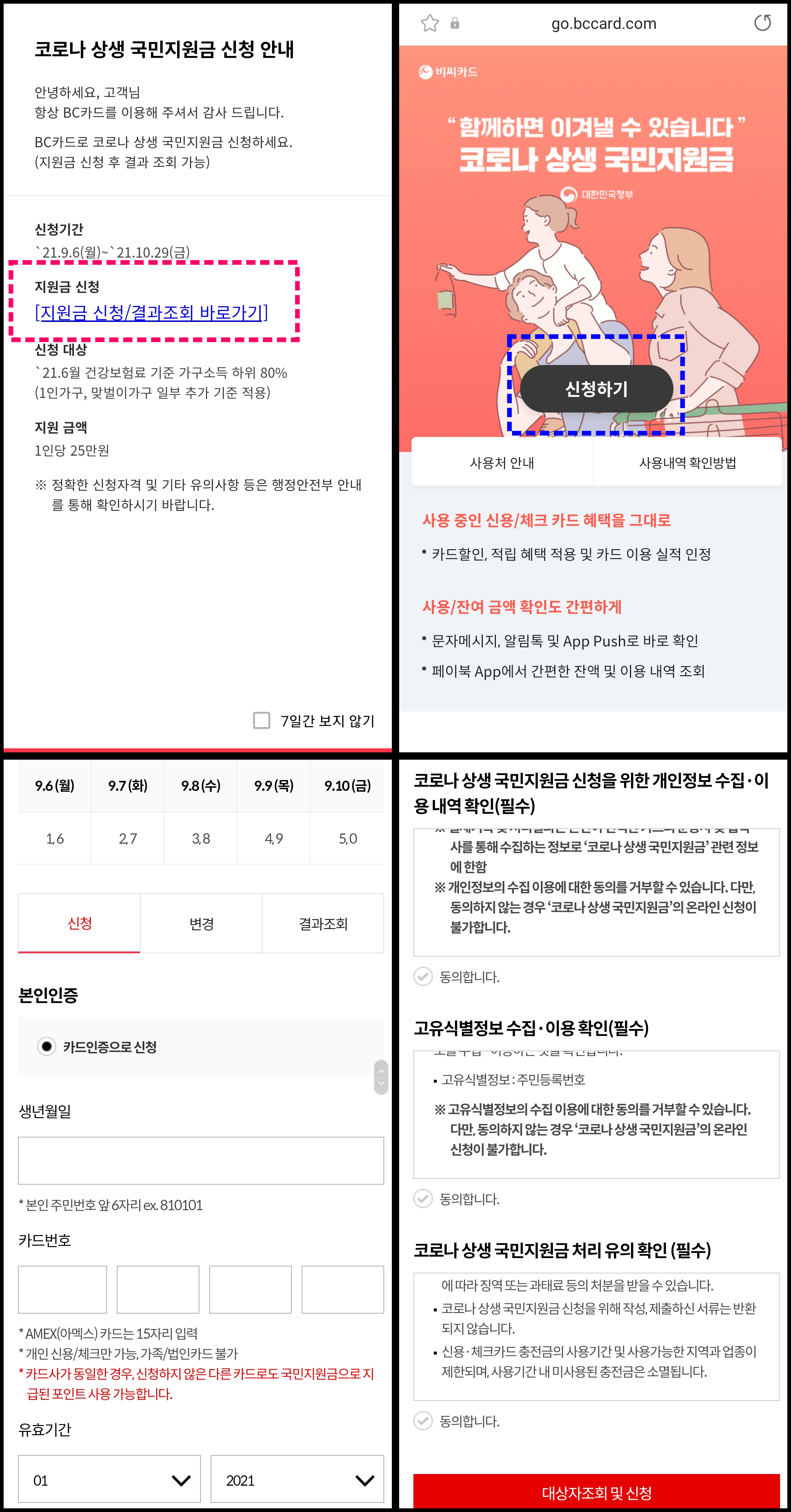 비씨카드 앱을 실행하면 코로나 상생 국민지원금 신청 안내가 떠서 바로 신청했어요. 카드번호와 생년월일 입력으로 본인 인증하니까 바로 재난지원금 대상인지, 또 얼마 받는지 결과가 딱 뜨더라고요.