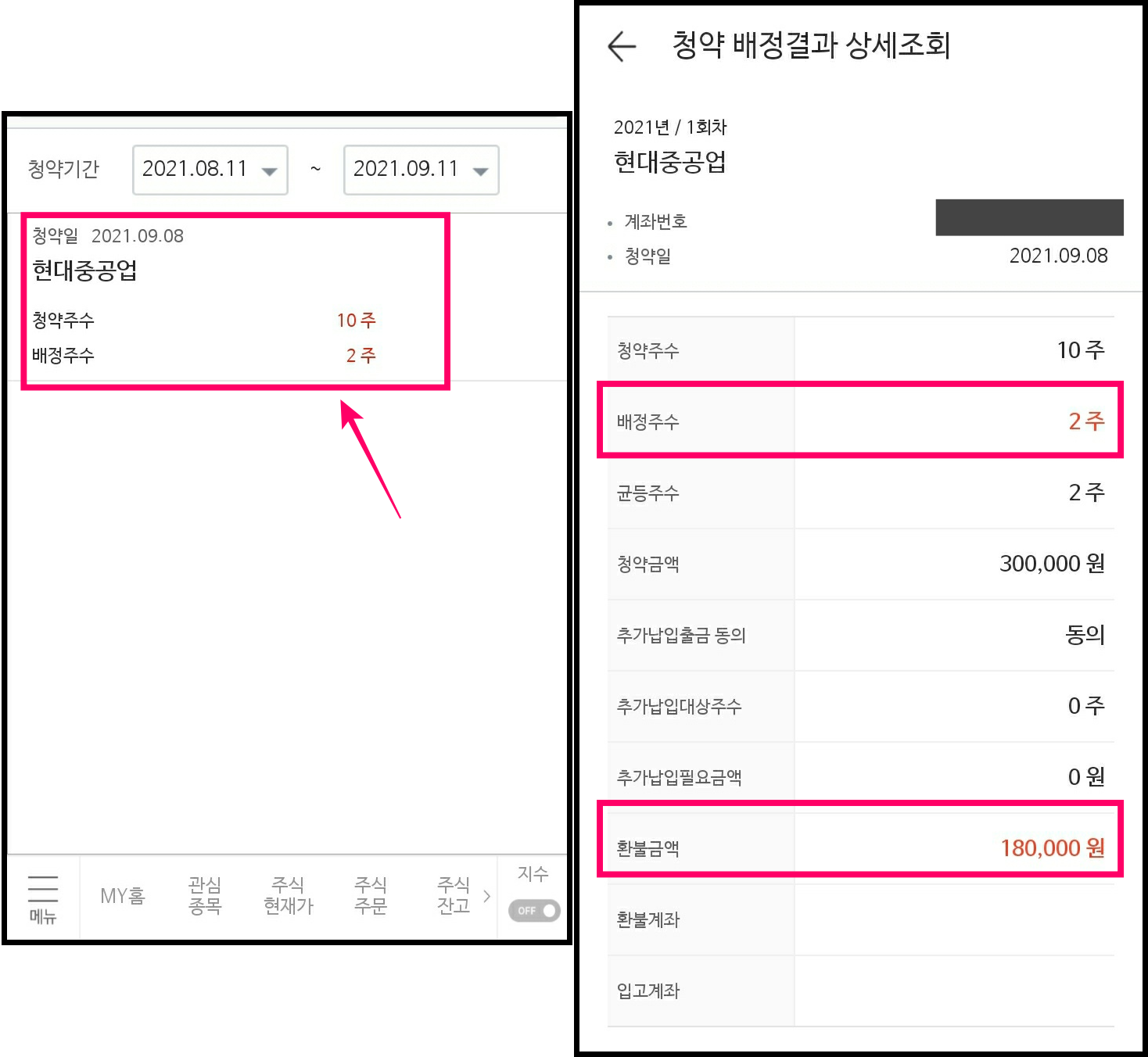 저는 현대중공업 균등으로 10주 신청했더니, 2주 배정이 되었네요. 공모가가 6만 원이었으니, 2주 가격인 12만 원을 제외한 18만 원이 환불이 되겠네요. 현대중공업 청약하신 분들 2주로 꽉꽉 채워서 배정받으셨으면 좋겠고, 상장 날인 9월 17일에 대응 잘하셔서 좋은 결과 있으시길 바랍니다.
