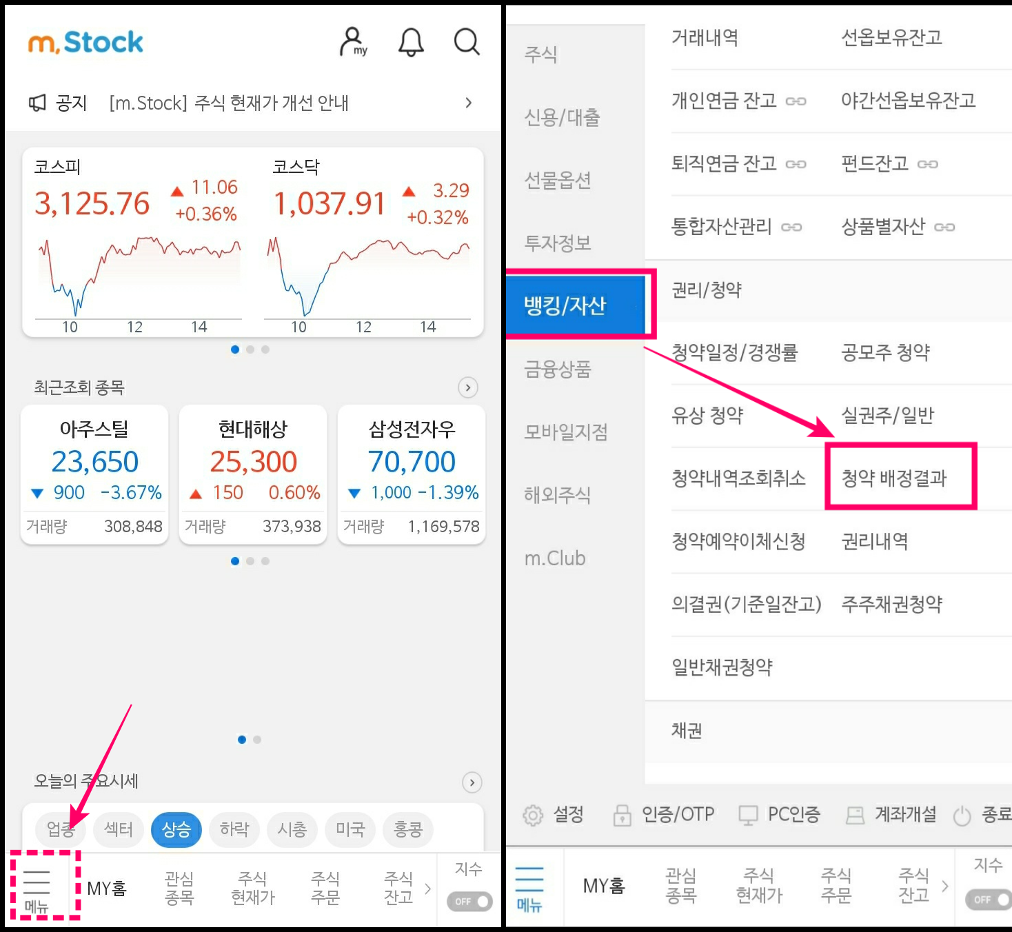 공모주를 하다보니 공모주로만 사용하는 계좌가 많이 늘어나고 있습니다. 그래서 공모주 청약하거나 배정 결과 확인하는데 조금 헷갈리더라고요. 미래에셋 공모주 배정 결과 확인은 로그인하고 메인 화면에서 하단에 메뉴 - 뱅킹/자산 - 청약 배정 결과에서 하면 됩니다.