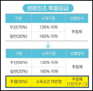 저소득층에 생애최초 특공 물량의 70%를 먼저 추첨으로 공급하고, 고소득자는 나머지 30% 특공 물량을 추첨으로 배정받을 수 있게 되었습니다. 단, 추첨 30% 물량은 우선공급 탈락자를 포함하여 고소득자와 함께 추첨을 진행한다고 합니다. 아래 이미지로 확인해보세요.