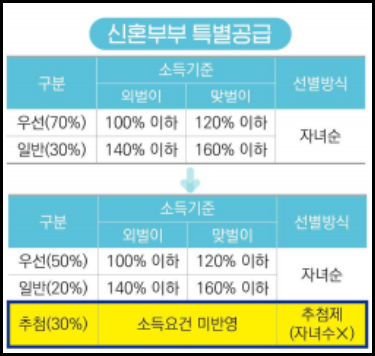 이번 개편안에서 소득과 자녀 여부는 제외되었습니다. 즉, 맞벌이로 인한 고소득자 신혼부부와 자녀가 없는 신혼부부도 위의 2가지 조건을 충족한다면 신혼부부 특별공급에 청약할 수 있습니다.