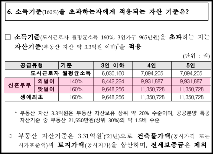 소득 160%이상인 경우 부동산 자산 3.3억 원 이하 (전세보증금은 제외)