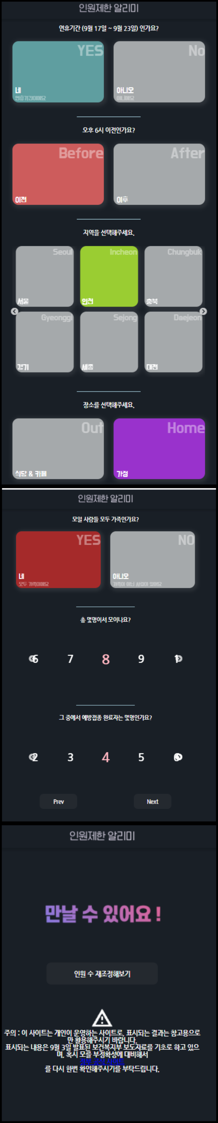 9월 3일 발표된 거리두기 내용을 기반으로 개인이 만든 '인원 제한 알리미'라는 사이트가 있는데요. 사적모임이 헷갈리시다면 이 사이트를 이용해보시는 것도 좋을 것 같습니다. 아래 이미지는 인원제한 알리미 사이트에서 연휴기간 동안 인천에서 가족 모임으로 몇 명이 만날 수 있는지 체크를 해본 거예요. 몇 가지 해당 사항에 체크를 하면 만나도 되는지 아닌지 알려줍니다.