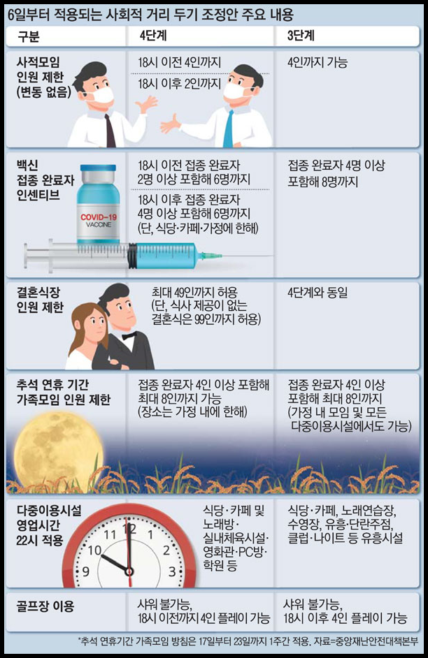 - 4단계 지역은 오후 6시 이전 6인까지(접종 완료자 2명 포함 시), 오후 6시 이후 6인까지(접종 완료자 4명 포함 시) 사적 모임 허용
