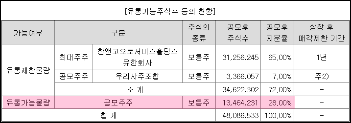케이카의 상장 직후 유통가능 주식은 공모주주밖에 없습니다. 유통가능 주식수는 약 1,346만 주로, 전체 주식수의 약 28%이며, 공모가 상단 기준으로 환산한 금액으로는 5,816억입니다. 기관 의무보유확약에 따라 달라지니 수요예측 결과를 확인해야겠습니다.