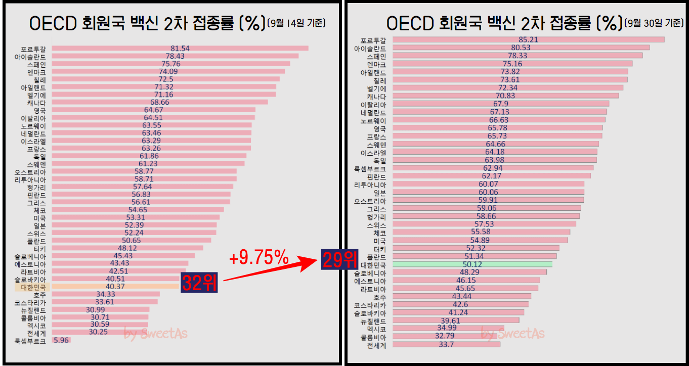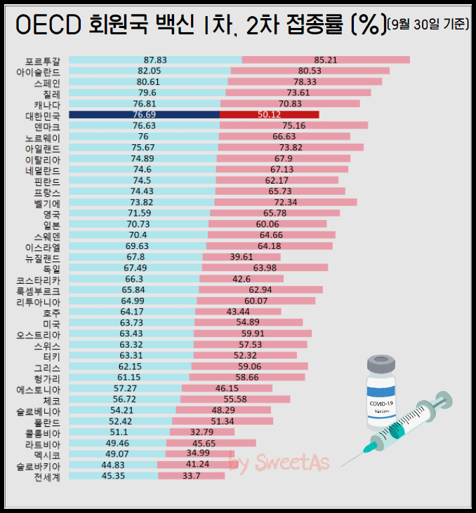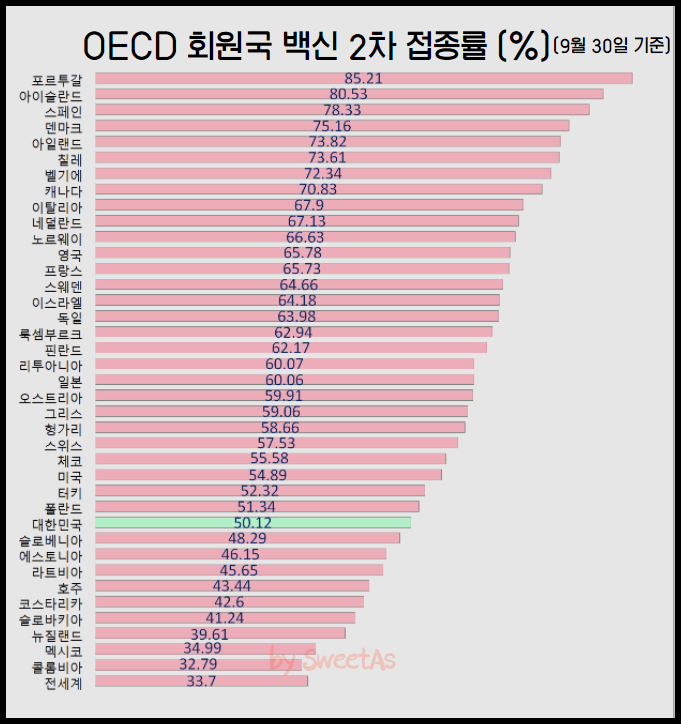 | OECD 국가 코로나 백신 2차 접종률(%) 및 순위 |
