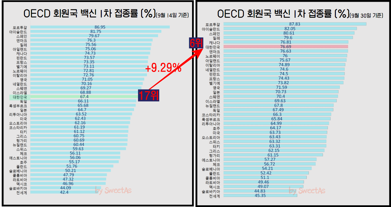 9월 14일과 9월 30일 기준으로 비교해보면, 우리나라 1차 백신 접종률은 9.29% 증가했습니다.