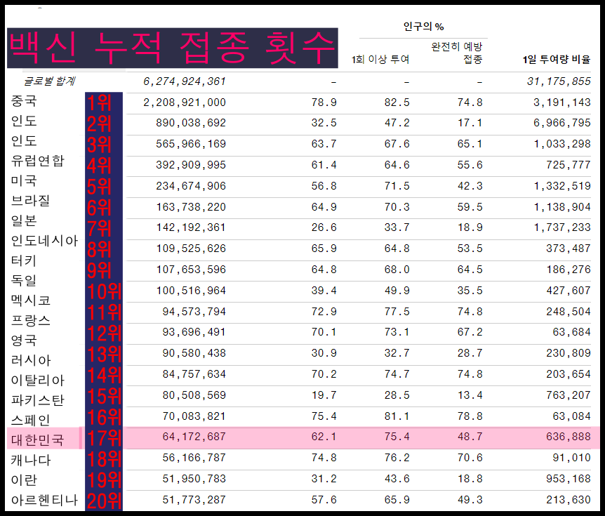 코로나 백신 누적 접종 횟수 1위에서 20위까지를 살펴봤습니다. . 우리나라는 총 백신 누적 횟수가 약 6,417만 회로 전 세계 중에서 17위입니다. 몇 개 국가를 살펴보면, 1위는 중국 (약 22억만 회), 2위 인도 (약 8억 9천만 회), 4위 미국 (약 3억 9천만 회), 7위 일본 (약 1억 4천만 회), 12위 영국 (약 9천3백만 회), 14위 이탈리아 (약 8천4백만 회), 18위 캐나다 (약 5천6백만 회)입니다.