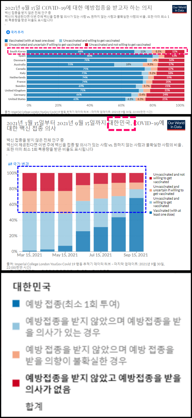 우리나라는 12% 정도가 백신을 아직 맞지 않았고, 앞으로도 맞고 싶지 않다고 하네요. 그래도 다른 국가들과 비교해서 백신을 맞고 싶지않은 비율(빨간색)이 작은 편인 것 같습니다. 미국은 백신 거부 비율이 25%로 높은 편이네요.