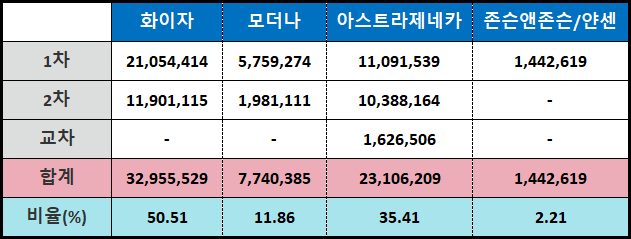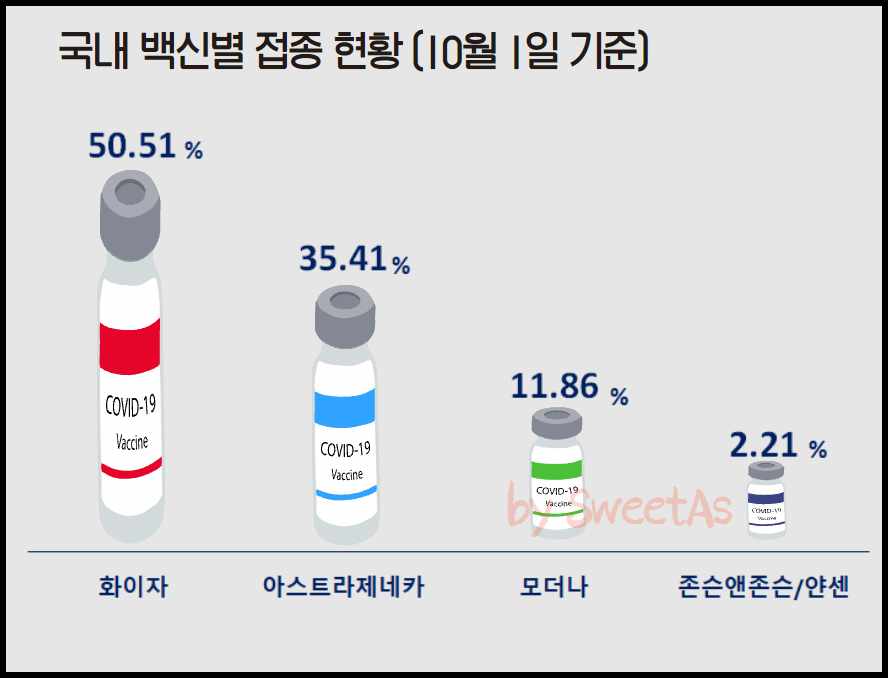 아래 그래프는 10월 1일 질병관리청 자료를 참고하여, 국내 백신별 누적 접종 횟수를 코로나 백신 총 누적 접종 횟수로 나누어 계산한 자료입니다. 백신 별 총 누적 횟수는 아래 표를 확인해주세요.