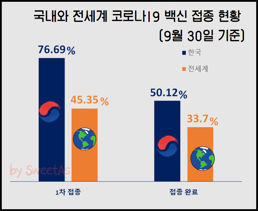 우리나라는 10월 1일 0시 기준으로 1차 접종은 총 39,347,573명으로 인구 대비 76.6%가 1차 접종을 받았고, 25.713.009명이 접종을 완료하여 인구 대비 50.1%가 접종을 완료하였습니다. 아래 표는 비교를 위해 9월 30일 기준으로 국내와 전 세계 백신 접종 현황 그래프를 만들어봤습니다.