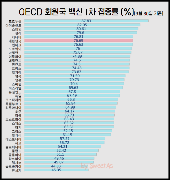 | OECD 국가 코로나 백신 1차 접종률(%) 및 순위 |
