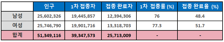 자세한 남성, 여성 1차, 2차 접종자수와 접종률은 아래 표에서 확인하세요.