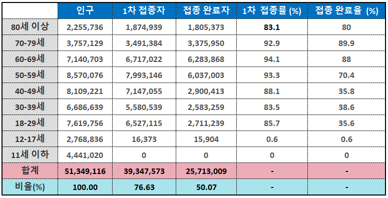 자세한 연령대별 접종자수와 접종률은 아래표에서 확인하세요.