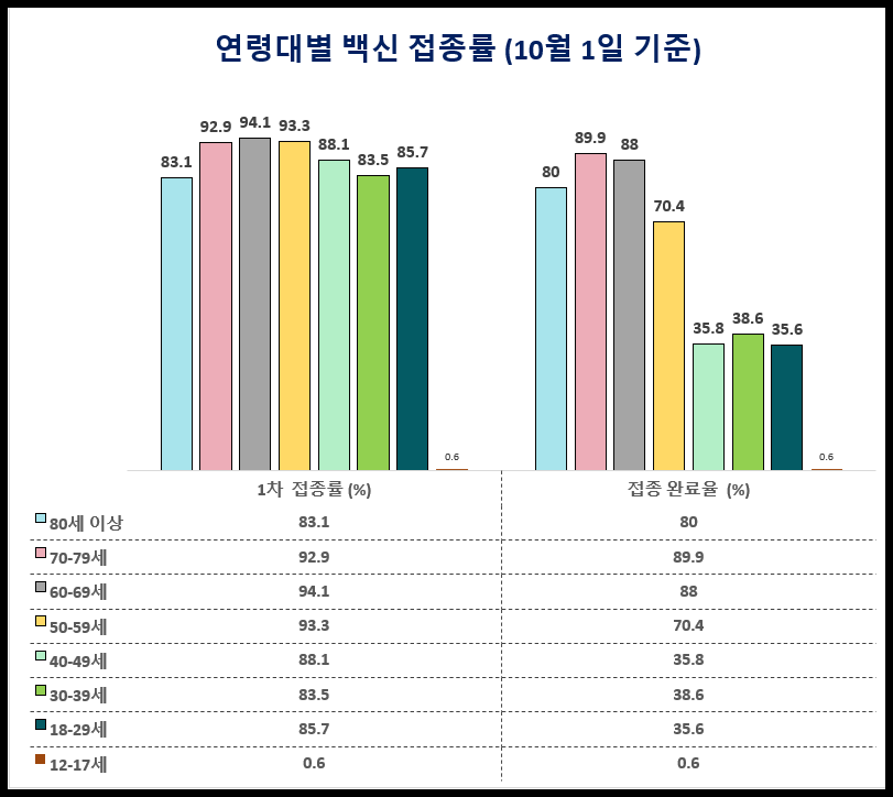 우리나라 코로나 백신 접종률이 많이 높아졌습니다. 10월 1일 기준으로 우리나라 1차 접종률이 76.69%, 2차 접종률이 50.1%이고요. OECD 회원국 38개국 중 1차 접종률은 6위, 2차 접종률은 29위입니다. 오늘은 연령대별로 코로나 백신 접종률과 미접종자 기준 예약률 현황 알아보겠습니다.