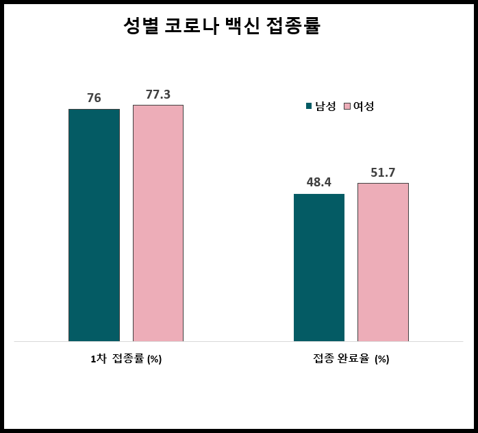 성별 코로나 백신 접종률은 남성과 여성이 비슷한 수준입니다. 남성과 여성의 1차 접종률은 각각 76%, 77.3%이고요. 2차 접종률은 각각 48.4%, 51.7%입니다.