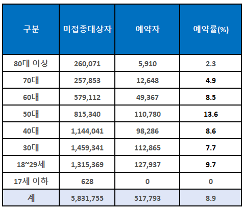 18세 이상 미접종자의 사전예약이 9월 30일 마감이 되었습니다. 총 약 583만 명의 미접종자 중 52만 명이 추가로 예약을 했다고 합니다. 연령대별 예약률은 50대 13.6%, 18~29세 9.7%, 40대 8.6%, 60대 8.5% 순으로 높았습니다.