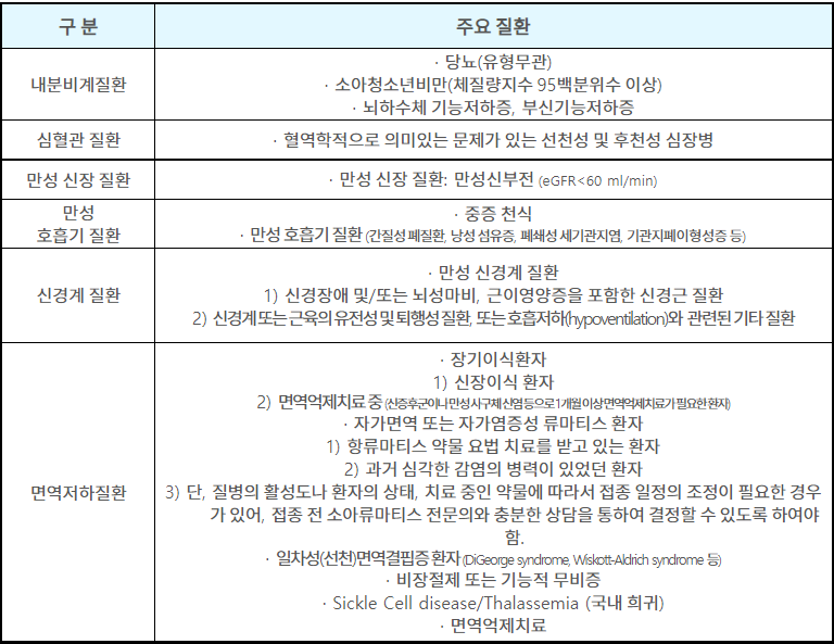 | 면역저하질환 | · 장기이식환자 1) 신장이식 환자 2) 면역억제치료 중 (신증후군이나 만성 사구체 신염 등으로 1개월 이상 면역억제치료가 필요한 환자) · 자가면역 또는 자가염증성 류마티스 환자 1) 항류마티스 약물 요법 치료를 받고 있는 환자 2) 과거 심각한 감염의 병력이 있었던 환자 3) 단, 질병의 활성도나 환자의 상태, 치료 중인 약물에 따라서 접종 일정의 조정이 필요한 경우가 있어, 접종 전 소아류마티스 전문의와 충분한 상담을 통하여 결정할 수 있도록 하여야 함. · 일차성(선천)면역결핍증 환자 (DiGeorge syndrome, Wiskott-Aldrich syndrome 등) · 비장절제 또는 기능적 무비증 · Sickle Cell disease/Thalassemia (국내 희귀) · 면역억제치료 |