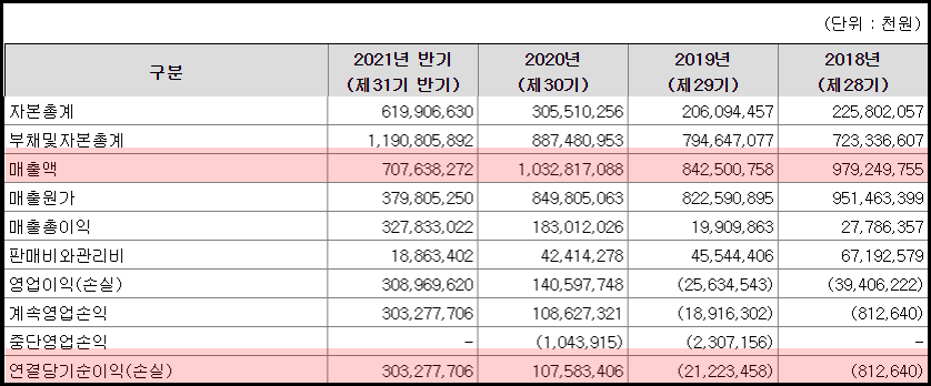 2019년까지만 해도 당기순이익이 적자였는데, 팬데믹으로 인해 컨테이너 운임이 상승함에 따라 2021년 반기 순이익이 3,032억 원을 달성했습니다.