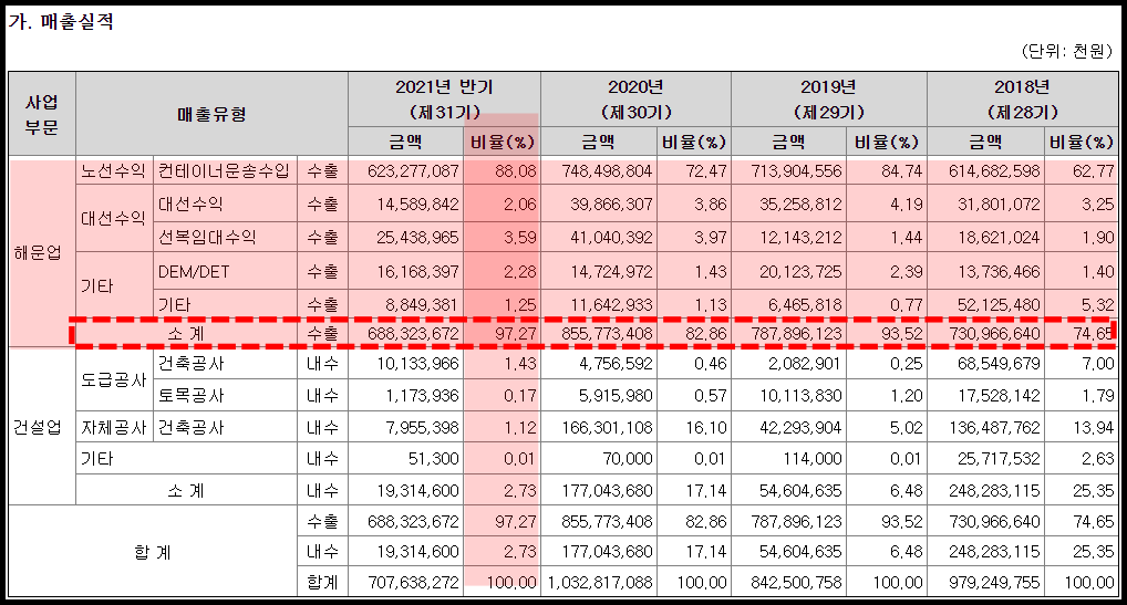 SM상선은 해운업과 건설업을 영위하고 있는데, 해운업의 매출이 97%가 넘습니다. 2021년 반기 매출의 97.27%가 해운업에서 발생하고, 해운업 중에서도 대부분의 매출은 컨테이너 운임수입(88%)에서 발생하고 있네요.