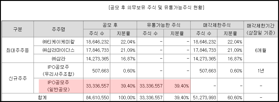 | 공모주식수 | 신주모집: 16,922,110주 (50%) 구주매줄 : 16,922,110주 (50%) |