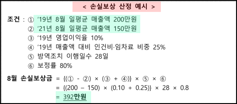 2019년 8월 일평균 매출이 200만 원이었는데, 2021년 8월 매출이 150만 원으로 감소한 경우를 예입니다. 영업이익률이 10%, 매출액 대비 인건비와 임차료 비중 25%를 적용했고요, 방역조치 이행일 수는 28일, 보정률 80%를 곱해 산정한 결과 8월 손실보상금은 392만 원입니다.