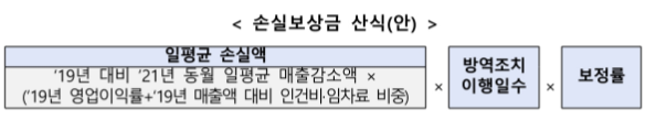 - 일평균 손실액은 코로나19 영향이 없었던 2019년 대비 2021년 같은 달에 일평균 매출 감소액에 2019년 영업이익률과 매출액 대비 인건비 임차료 비중의 합을 곱하여 산정합니다. 보상금 산정에 필요한 매출 감소액, 영업이익률 등은 업체별 과세자료를 활용하여 객관적으로 산정할 예정이라고 하네요.