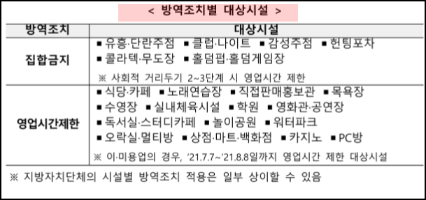 방역조치를 시행했던 대상시설은 아래 표의 업종들입니다.