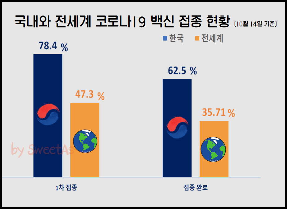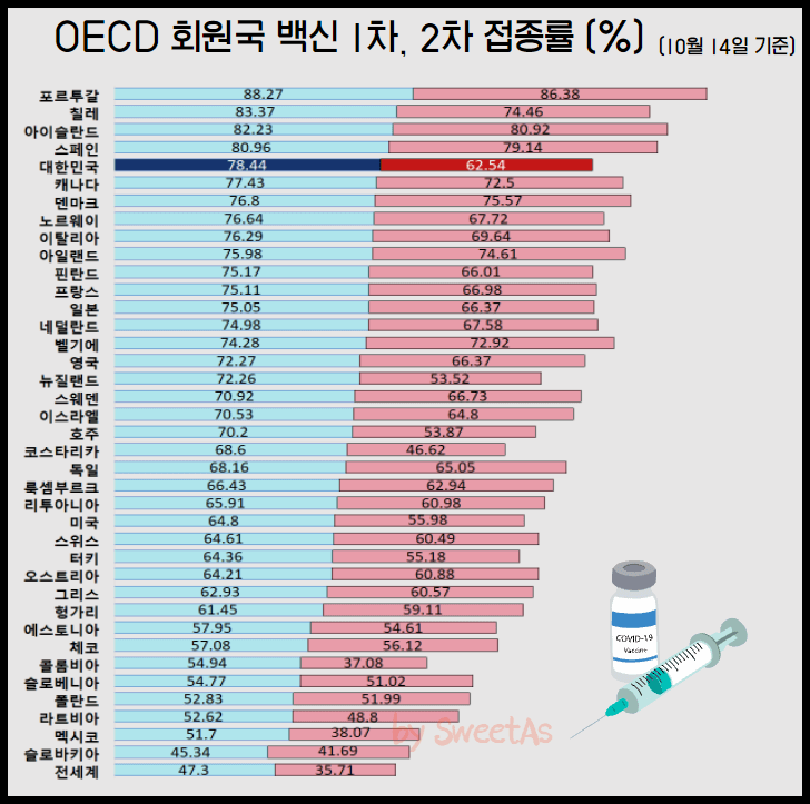 우리나라 백신 접종률이 많이 올라갔습니다. 9월 30일 이후 세계 백신 접종 현황을 확인해보니, OECD 국가 중에서 1차 접종률은 상위권이며, 2차 접종률이 많이 상승한 걸 확인할 수 있었습니다. 10월 14일 질병관리청, 옥스포드 마틴스쿨, 블룸버그 자료 토대로 전 세계 백신 접종 현황, 코로나 1차, 2차 백신 접종률, OECD 국가별, 국내 백신 별 코로나 백신 접종 현황 및 순위를 살펴보도록 하겠습니다. 9월 30일 이후에 얼마나 접종률이 달라졌는지도 확인해볼게요. 또한 추가접종(부스터 샷)에 대한 현황도 간단히만 확인해보겠습니다.