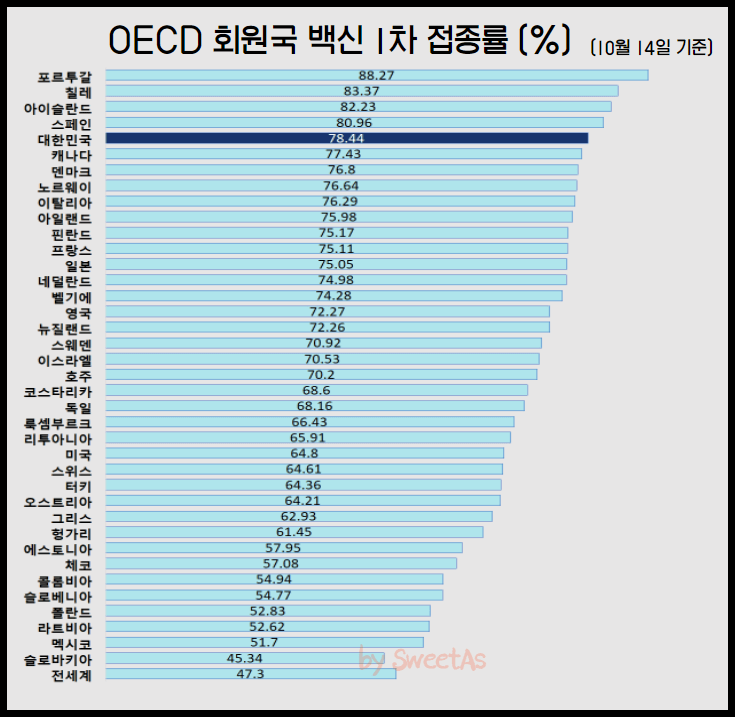 | OECD 국가 코로나 백신 1차 접종률(%) 및 순위 |