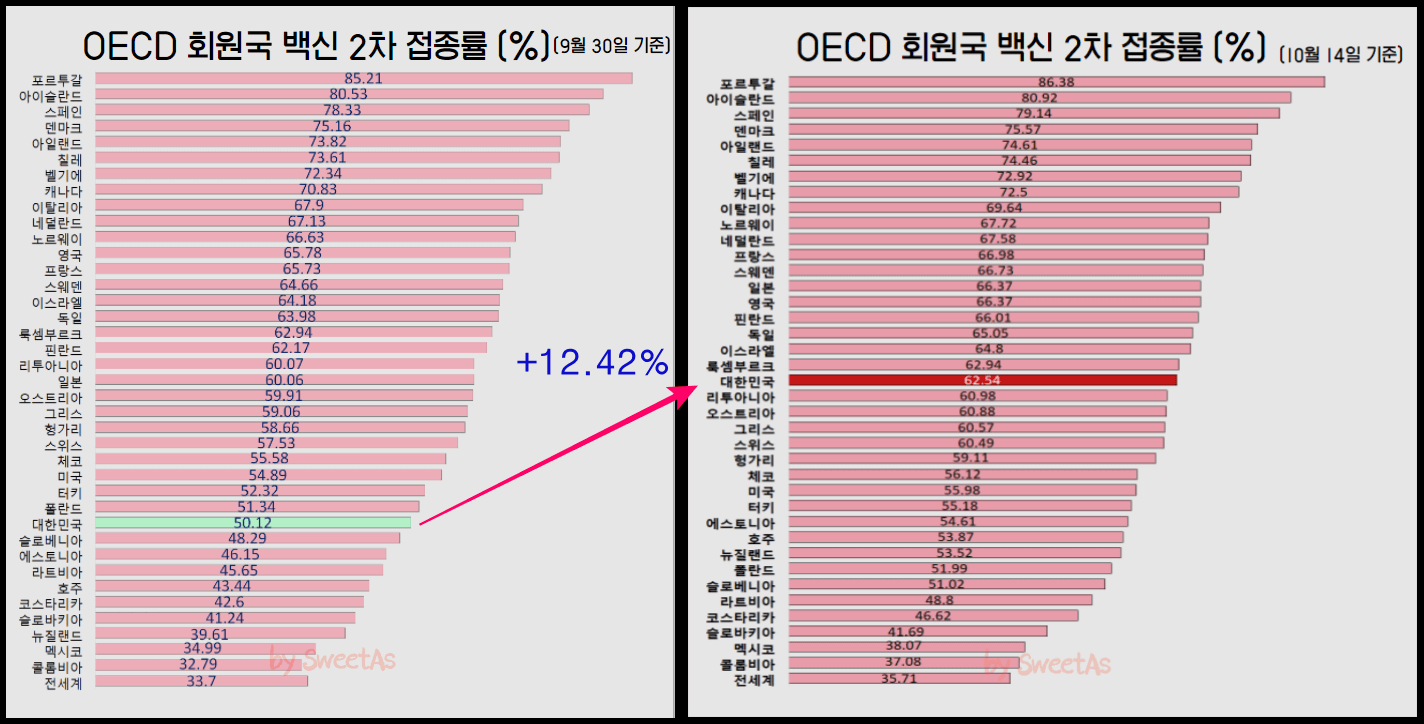 9월 30일과 비교해보면, 우리나라 2차 접종률이 약 12.42% 증가한 것을 확인할 수 있었습니다.