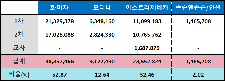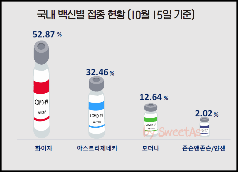 아래 그래프는 10월 15일 질병 관리청 자료를 참고하여, 국내 백신별 누적 접종 횟수를 코로나 백신 총 누적 접종 횟수로 나누어 계산한 자료입니다. 자세한 백신 별 누적 접종 횟수는 아래 표에서 확인해주세요.
