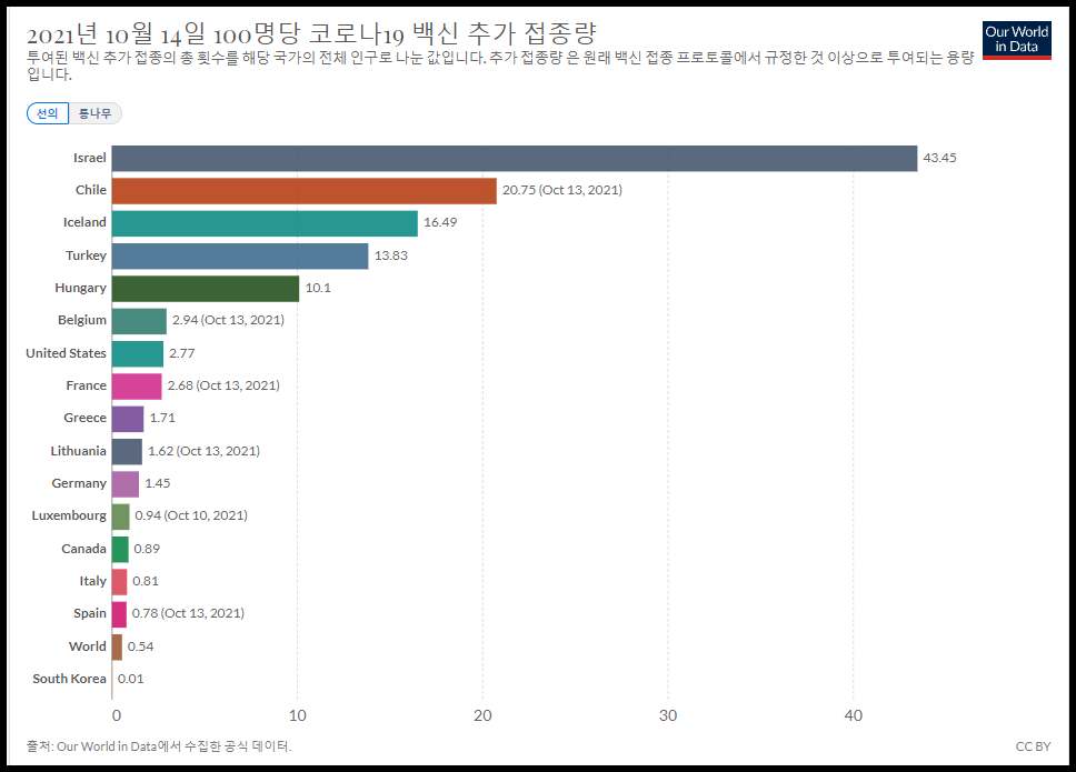 우리나라는 추가접종을 이제 막 시작했지만, 이스라엘, 칠레, 아이슬란드, 터키, 헝가리, 벨기에, 미국 등은 추가접종량이 활발하게 진행되고 있는 것 같습니다.