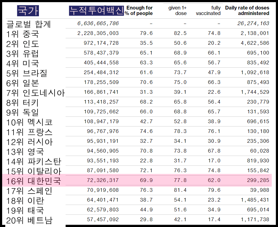 코로나 백신 누적 접종 횟수를 1위에서 20위까지 확인해봤습니다. 우리나라 총 백신 누적 횟수는 약 7,232만 회로 전 세계 중에서 16위입니다. 몇 개 국가를 살펴보면, 1위는 중국 (약 22억만 회), 2위 인도 (약 9억 7천만 회), 4위 미국 (약 4억 5백만 회), 6위 일본 (약 1억 47만 회), 13위 영국 (약 9천4백만 회), 15위 이탈리아 (약 8천7백만 회), 19위 태국 (약 6천2백만 회)입니다.