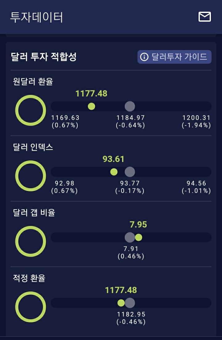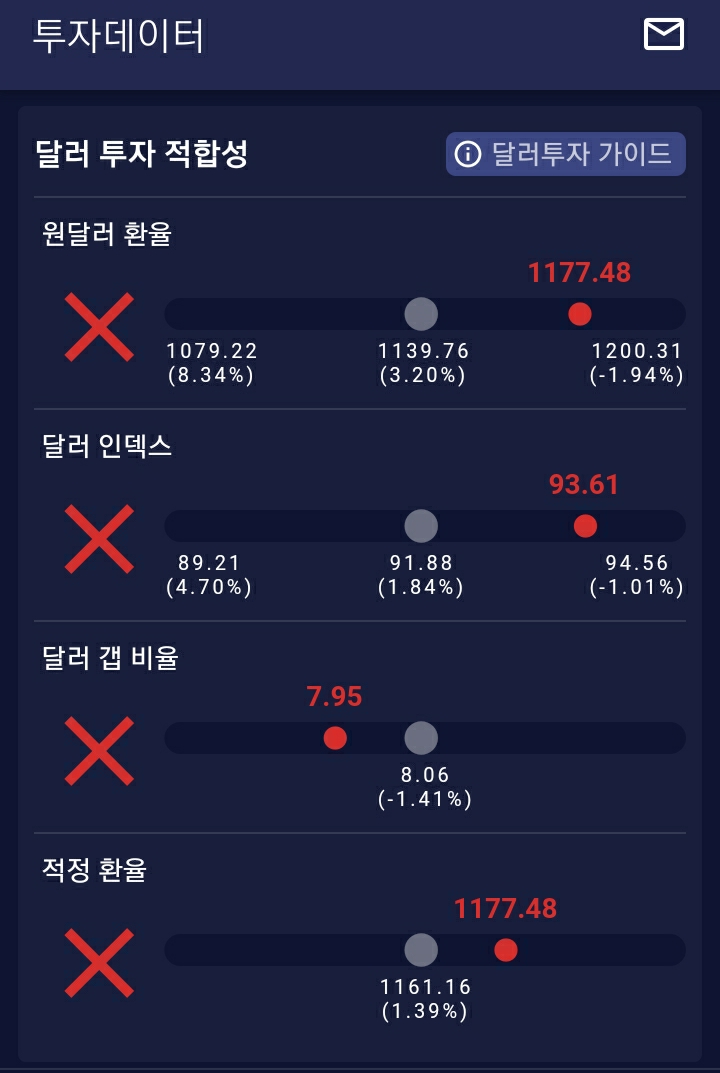 박성현 작가님이 개발한 '달러 리치'라는 무료 앱이 있는데요. 거기에 투자지표가 나와 있고, 투자지표를 기반으로 지금 달러 투자 적정한 시기인지 알려주더라고요.