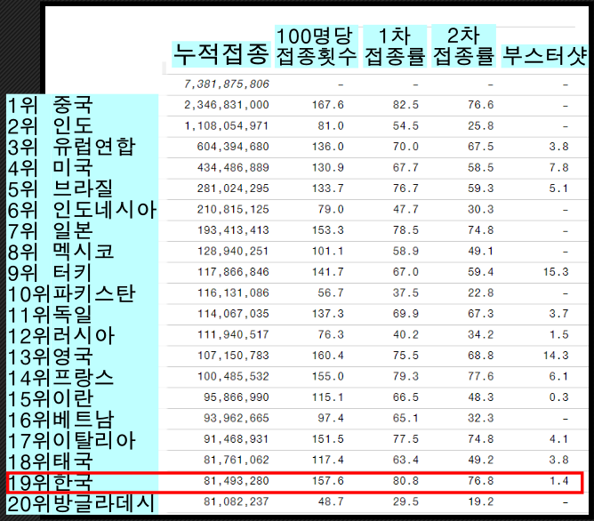 코로나 백신 누적 접종 횟수를 1위에서 20위까지 확인해봤습니다. 우리나라는 약 8,100만 회로 전 세계 중에서 19위입니다. 몇 개 국가를 살펴보면, 1위는 중국 (약 23억만 회), 2위 인도 (약 11억만 회), 4위 미국 (약 4억 3천만 회), 7위 일본 (약 1억 9천만 회), 13위 영국 (약 1억만 회), 17위 이탈리아 (약 9천1백만 회), 20위 방글라데시 (약 8천만 회)입니다.