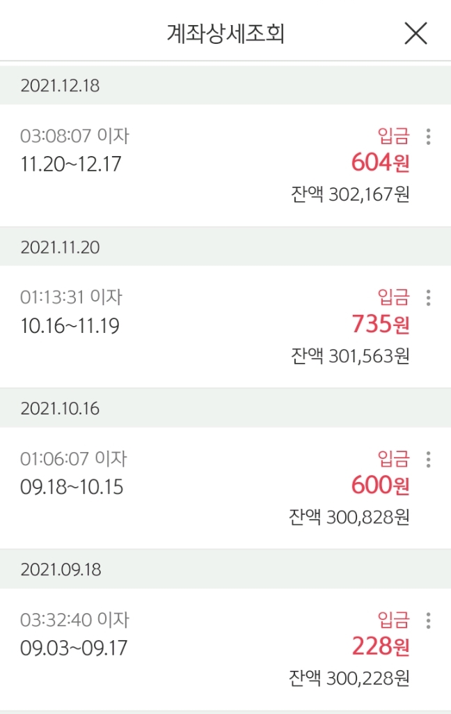 매월 600원에서 735원의 이자가 조금씩 다릅니다.