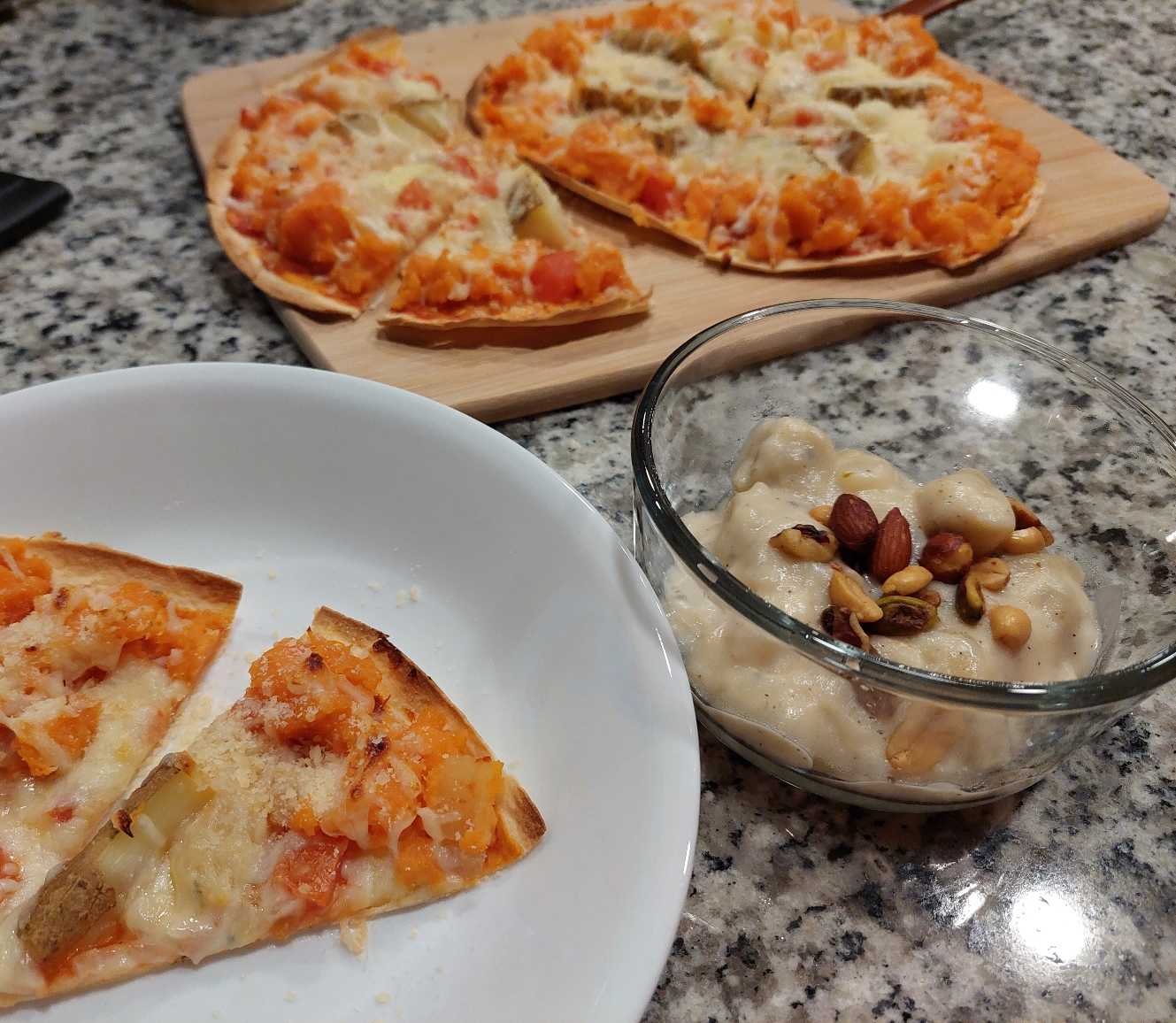 삶은 고구마를 우유와 꿀을 살짝 넣어 고구마 무스를 만들어 대충 끝에 올려줬고요. 삶은 감자도 웨지 모양으로 잘라서 올려주고 마지막에 모짜렐라 치즈로 마무리해줬습니다.