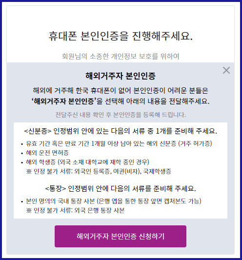 인정 가능 신분증 : 거주 허가증, 해외 운전 면허증, 해외 학생증