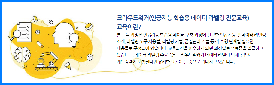 무료 데이터 라벨링 교육은 AI DATA 사이트 말고도, 지역별로 데이터 라벨링 인력 양성 교육으로 진행되는 곳도 있습니다. 또한, 크라우드 웍스에서 유료로 데이터 라벨링 전문 교육을 제공하고 있고요.