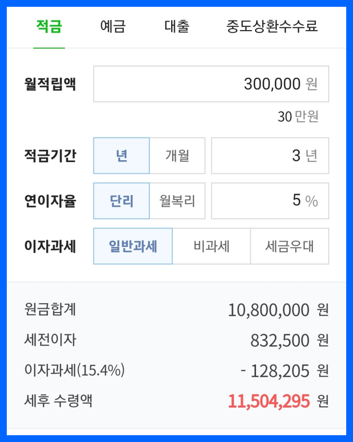 이자계산기로 계산해보니, 월 30만원 3년동안 적금 부으면 원금은 1,080만원이고, 이자는 세전 약 83만원입니다. 그래서 3년 후 약 1,150만원을 수령할 수 있습니다. 3년동안 천 만원 통장 만든다고 생각하고 저도 하나 가입했습니다.