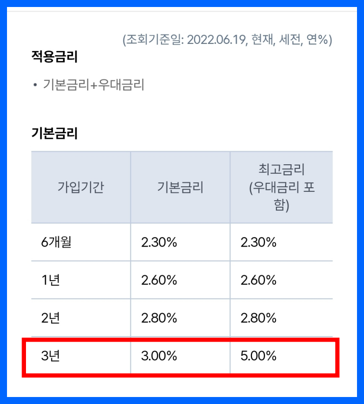 가입 기간별로 금리가 달라요. 6개월 2.3%, 1년 2.6%, 2년 2.8%, 3년 5%입니다.