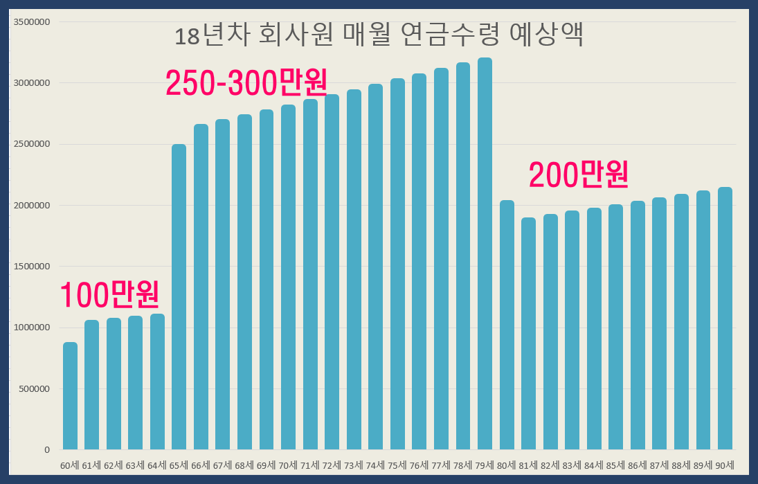연도별로 받을 수 있는 연금을 보기 쉽게 월별 연금수령액으로 정리해 보니까, 퇴직연금과 연금저축펀드로는 매월 100만원, 거기에 국민연금이 더해지니까 250-300만 원 정도 수령하게 되는 것 같네요.